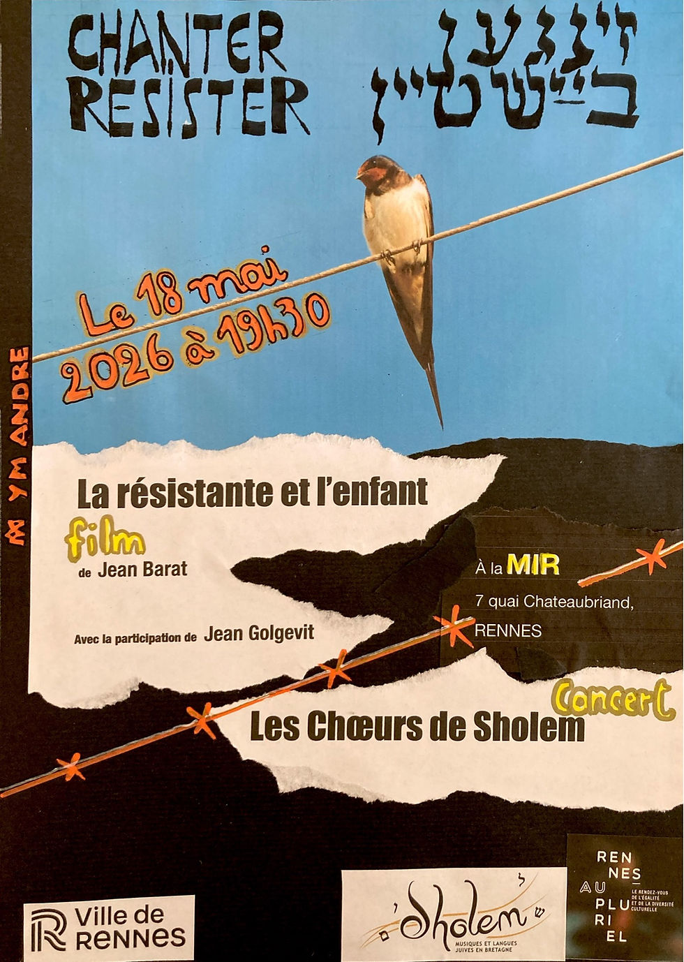 L'association Sholem organise à l'occasion de Rennes au Pluriel une soirée intitulée "Chanter Résister" à la Maison Internationale de Rennes (MIR) le lundi 18 mai à 19H30.